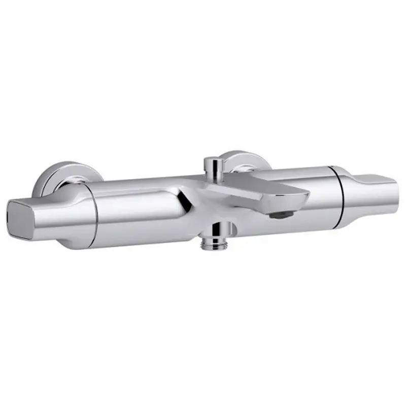 Смеситель для ванны Jacob Delafon Aleo E72286-CP имеет литой излив. Изготовлен из качественной латуни и имеет защитное покрытие, что способствует устойчивости к коррозии и резким перепадам температуры. Управление термостатическое, настенный монтаж на два отверстия.